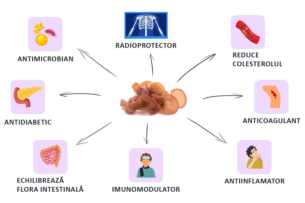 Studiile din ce în ce mai frecvente vin să confirme utilizările tradiționale ale ciupercii Auricularia auricula judae, care prezintă o activitate biologică semnificativă, incluzând proprietăți antioxidante, antimicrobiene, anticancerigene, antidiabetice, antiinflamatorii, imunomodulatoare, antihipercolesterolemice și radioprotectoare. Le găsiți în secțiunea Studii a aplicației Esențiale, unde vom mai adăuga pe măsură ce apar.